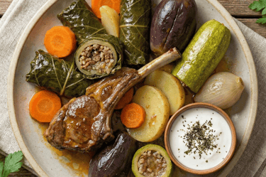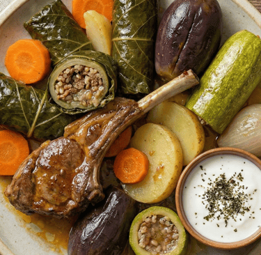 Swiss chards, Lamb, Rice, Zucchini, Eggplant, Onion, Potato, Carrots, Yogurt Sauce.